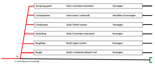 Bougie vervangen en tegen blok gehouden, geen vonk.