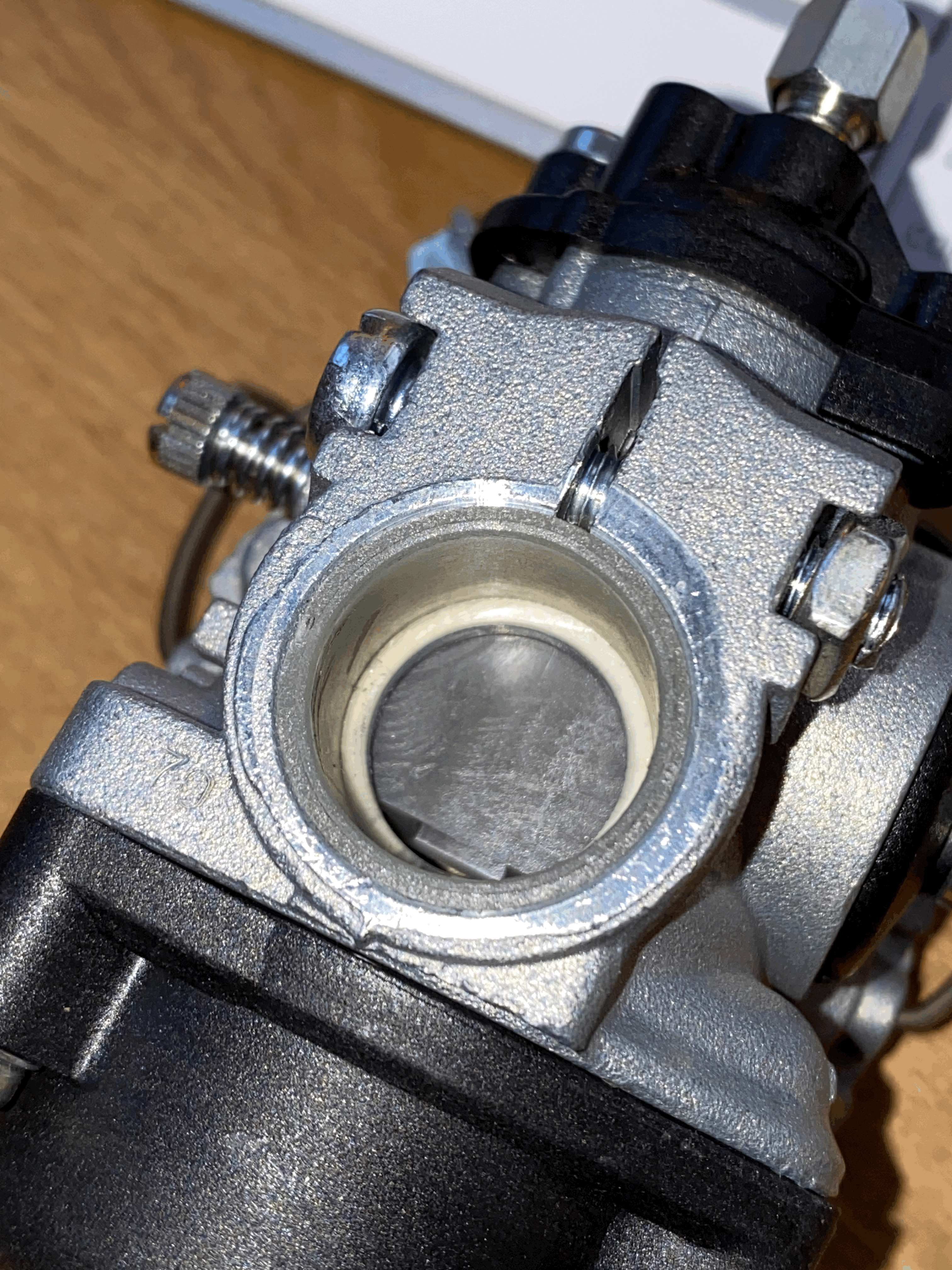 De nylon bus die in mijn nieuwe 15/15 heeft hij achterin bij de gasschuif nog een randje naar binnen(zie fotos). Het spruitstuk schuift dus tegen de nylon bus zelf aan en niet tegen het ijzer van de carburateur zelf aan. Is deze rubberen ring dan nog nodig? Zo ja waar moet ik deze dan plaatsen? (in de nylon bus past deze niet, en er achter heeft hij weinig nut, omdat deze dan alleen tussen de carburateur en de nylon bus zit en niet tegen het spruitstuk zelf. Of moet er misschien een andere nylon bus in zonder deze rand, zodat een rubberen ring wel zinvol is?