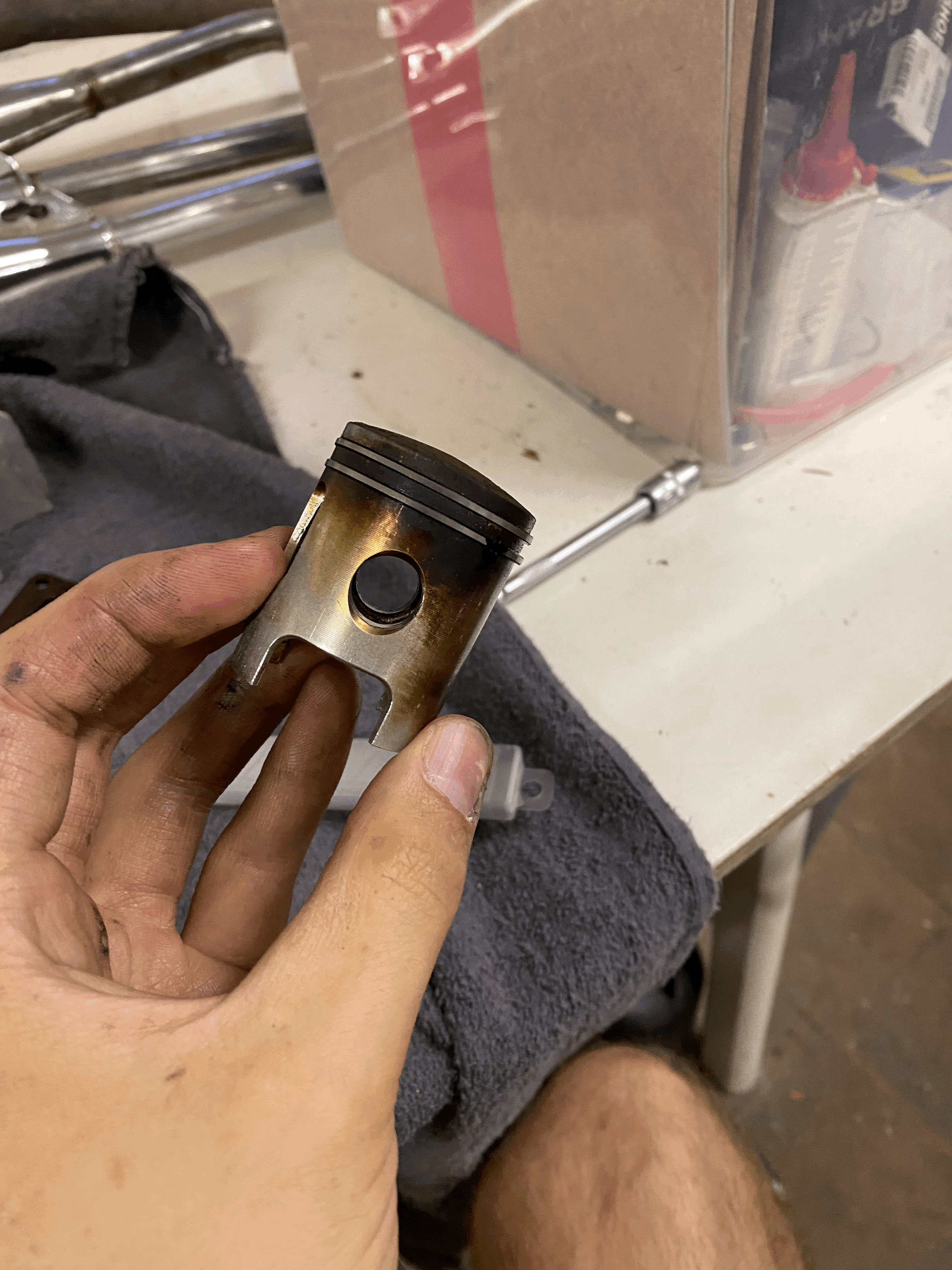 Dat de zuiger zo zwart onder de zuigerveren is is niet normaal, ook niet als je 5000 km gereden hebt.