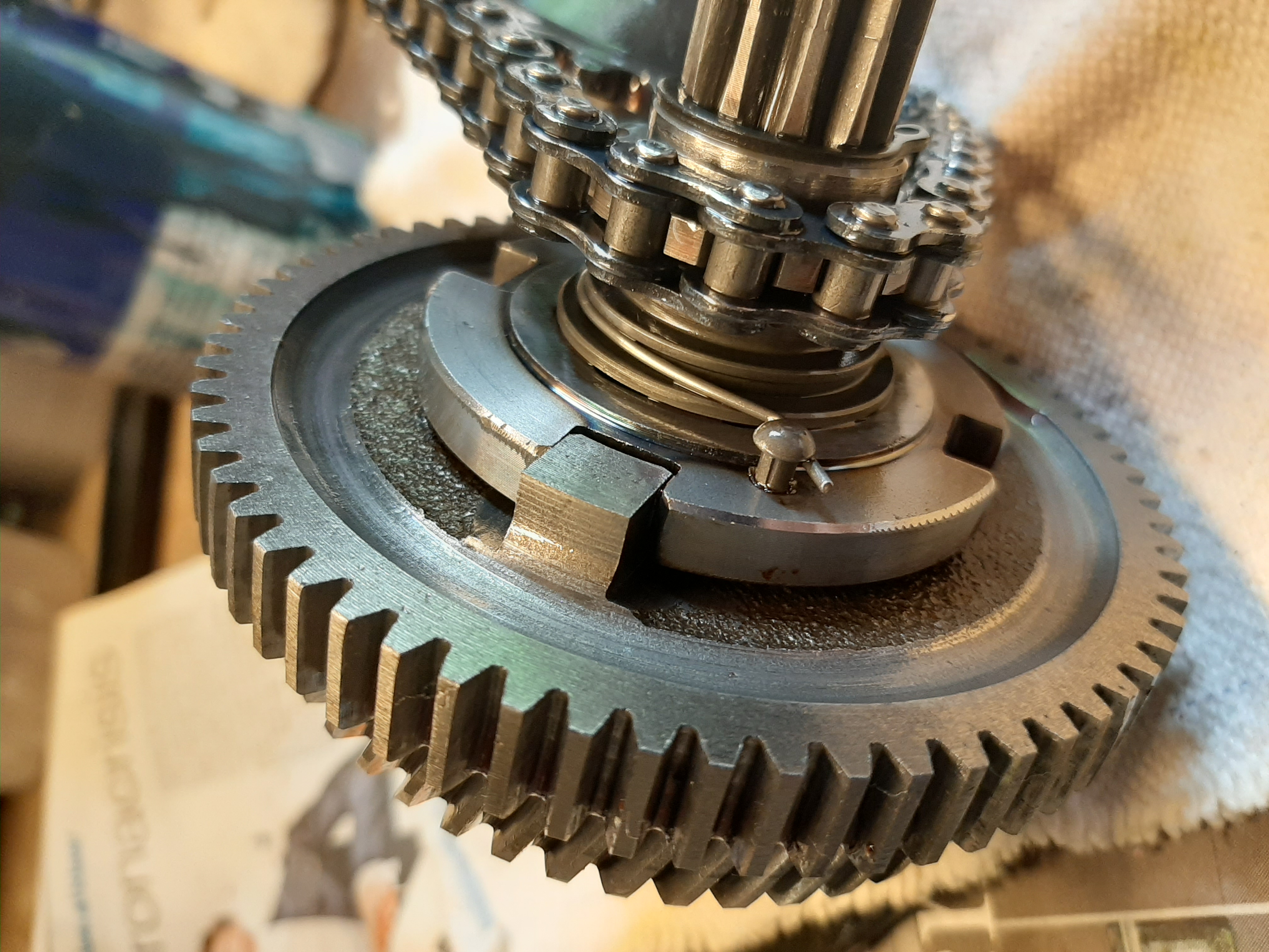 Ringetje 10 doel jij op? Pff de veer oprekken is een hele klus zie ik al..Nee, de ring die jij beschrijft hoort achter de moer om deze te blokkeren. Tussen koppeling en huis zit nog een ring. Kijk maar eens in de exploded views in de wiki. Deze zorgt voor een kleine zijdelingse speling van het huis en dat de koppeling vrij kan draaien van het huis bij stationair toerental. Of het huis kan draaien bij stilstaande motor.