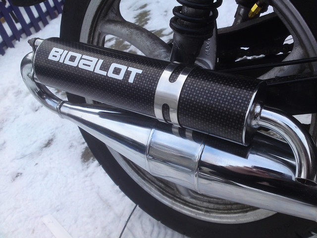 Nu gaat de chrome technigas uitlaat op deze Funsport'r maar dat doe ik pas als hij op de 500km staat op de teller want dan is hij al redelijk ingereden. Daarna zie ik wel verder of ik hem opvoer of niet, hooguit een kleiner tandwiel ik heb mn tijd met hard rijden van brommers al gehad denk ik