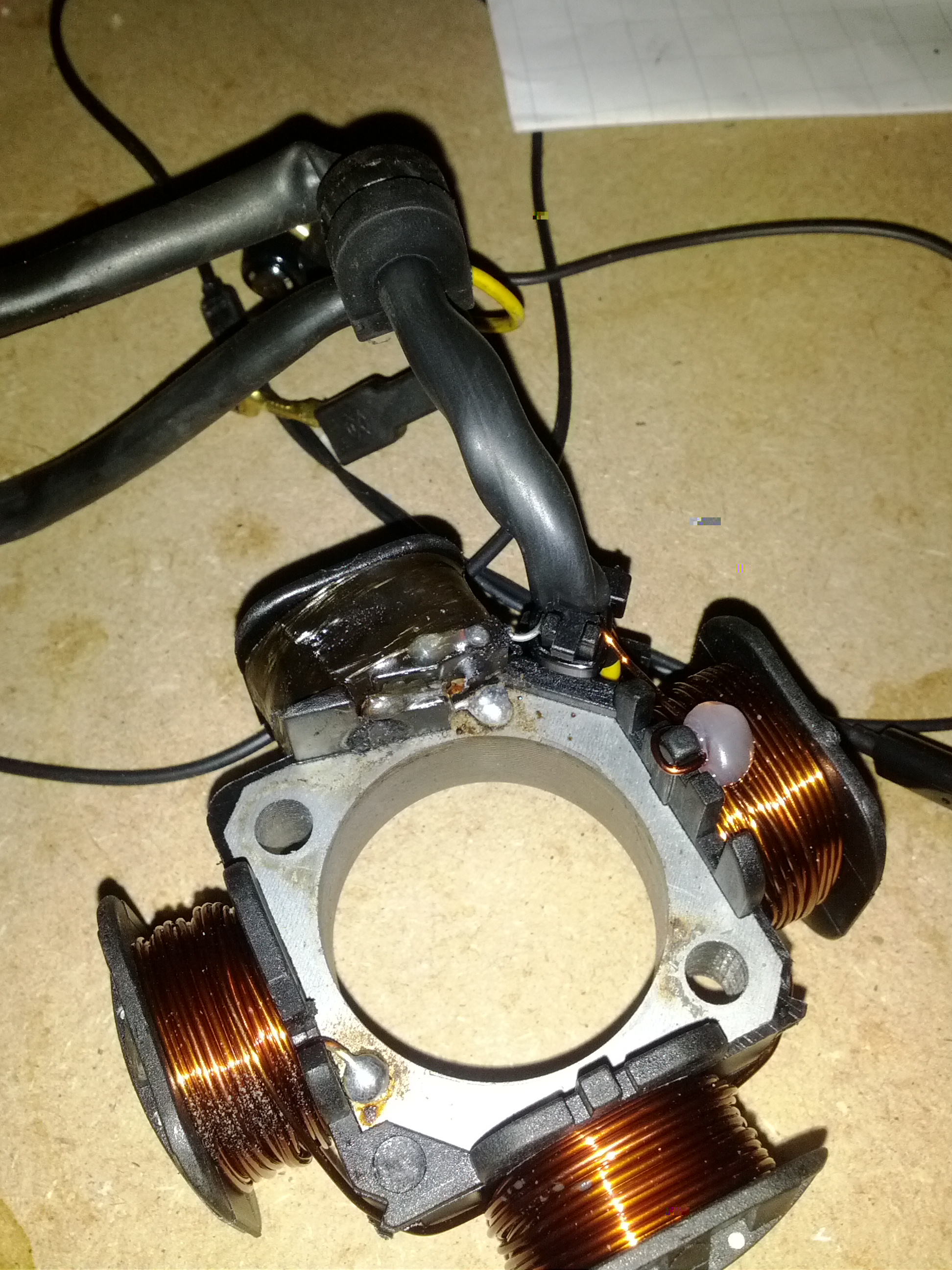 En als je de zwarte draad rechtstreeks op de bobine aansluit zonder de by-pass over de uitknop nog hetzelfde probleem? Dan kan de ontstekingsspoel defect zijn of de solderingen achter het zwarte kunststof kapje tussen de spoelen losgeraakt. Eventueel kun je dit doorpiepen met een multimeter op Ohm stand.