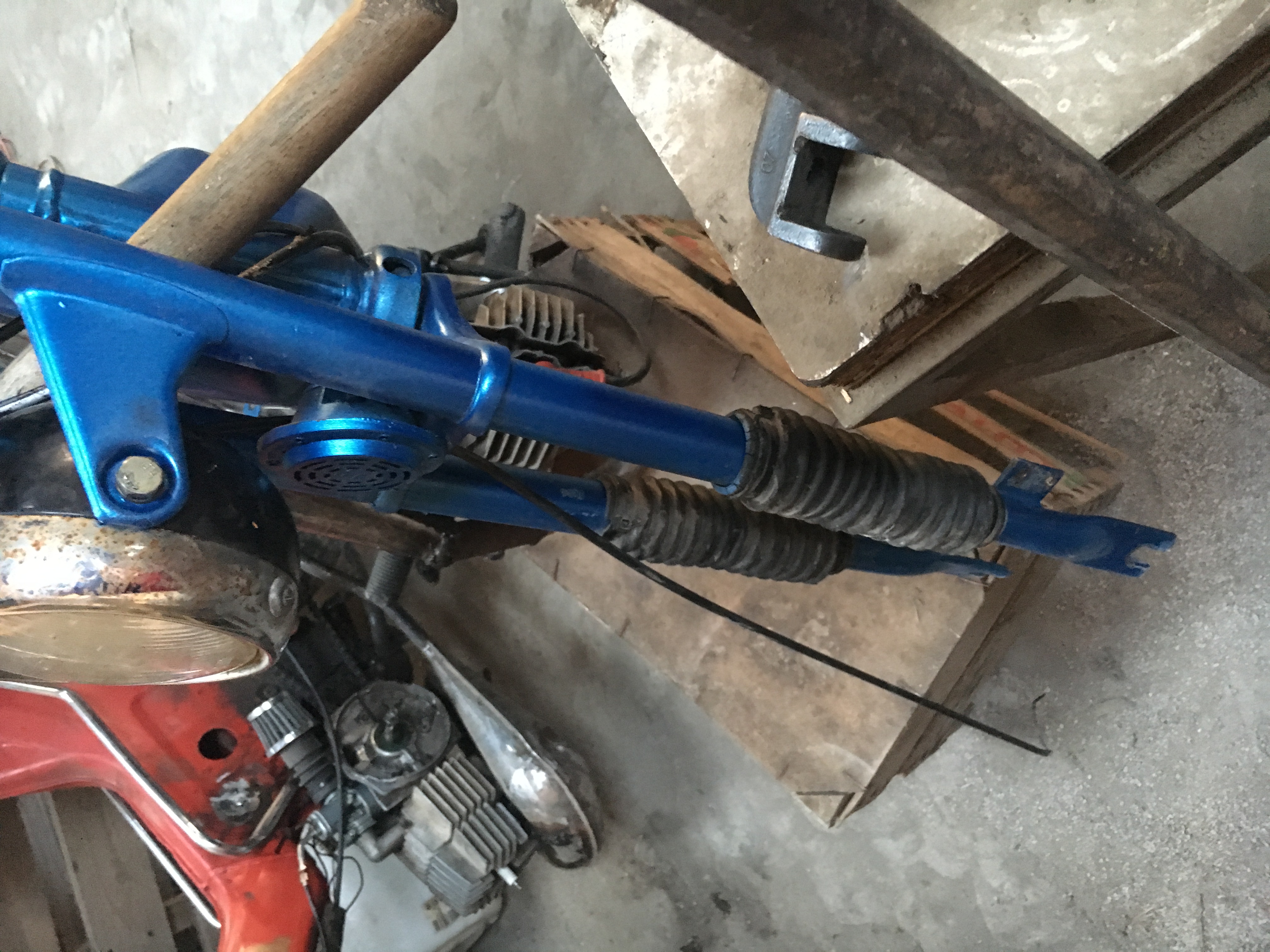 dit ideetja ouders, 'die brommers gaan nu op slot!' hebben ze al zo vaak gezegd, gebeurt toch nooit. heb net effe gekeken bij voorvork ennnnnnnnnnnn.... ivo heeft em recht gekregen! met flink veel kracht met een koevoet etc etc staat hij nu echt wel recht. ik zie dat hij verbogen was idd wat ik al dacht bij de onderste kroonplaat. daar ga ik misschien aan de onderkant iets tussen lassen om hem te verstevigen, vervolgens ook effe een likje verf geven natuurlijk. misschien ook een ideetje om hem in de toekomst eens wat op te hoogenOei, balen Ivo!