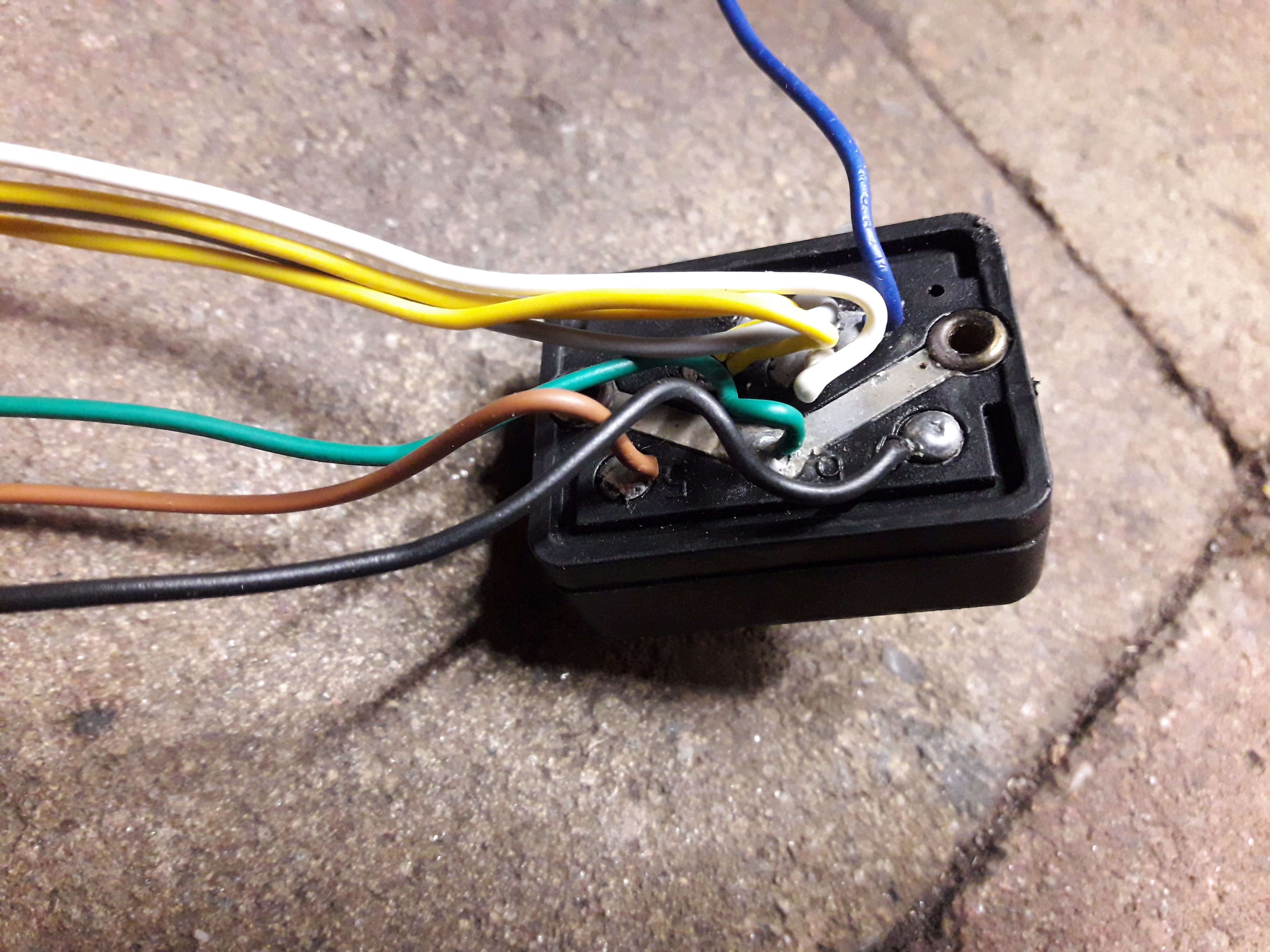 Nu plaats ik bovenstaande schakelaar (ronde) er tussen en doet hij niets, zodra ik aan de zwarte draad kom met bruin gaat hij uit, maar niet door drukken op de knop.