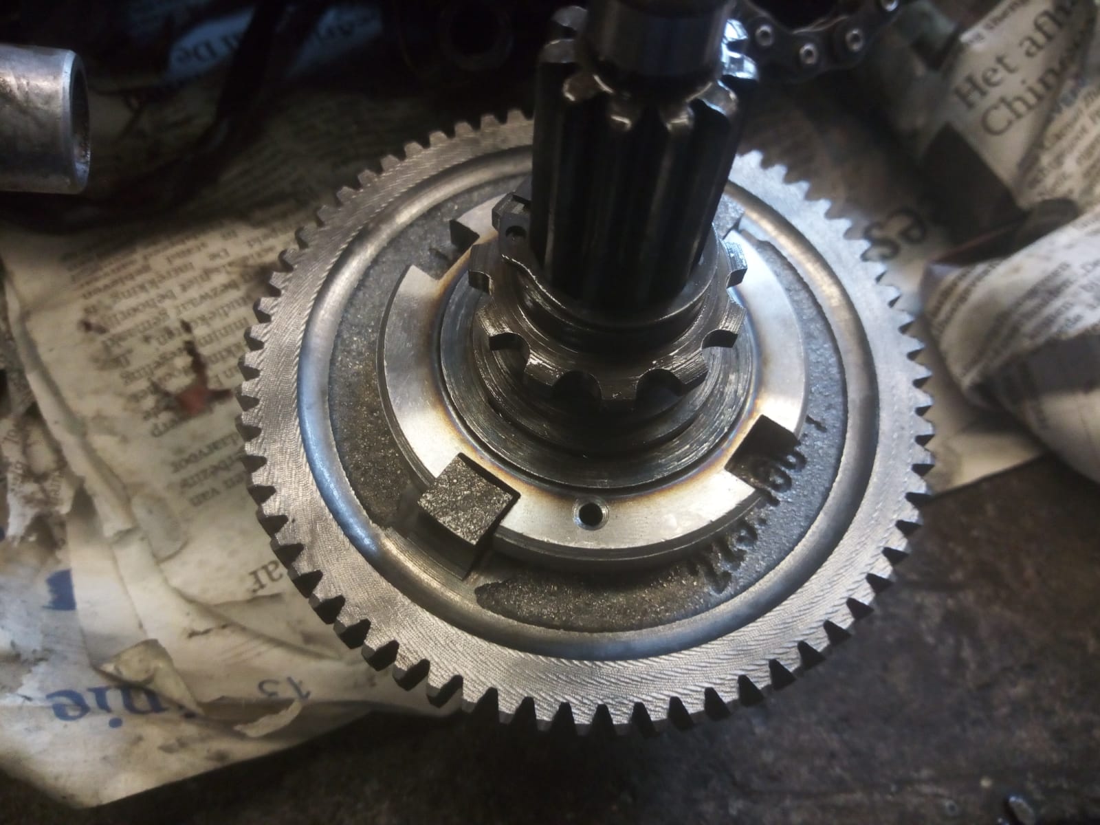 Aanvulling op bovenstaande, of is het zo dat het vraagtekenveertje tussen het grote tandwiel en de aandrijfplaat zit? Dat ik nu dus tegen de achterkant aan zit te kijken? Sorry voor de misschien domme vragen, wij zijn beginners.....