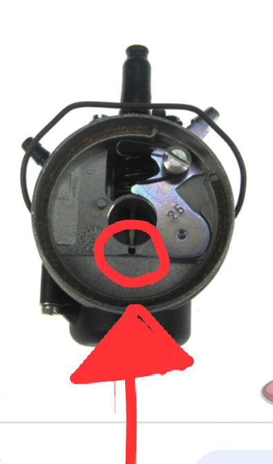 Normaal zou er een pijpje achterop moeten zitten die overtollige benzine weer door de carburateur zuigt.