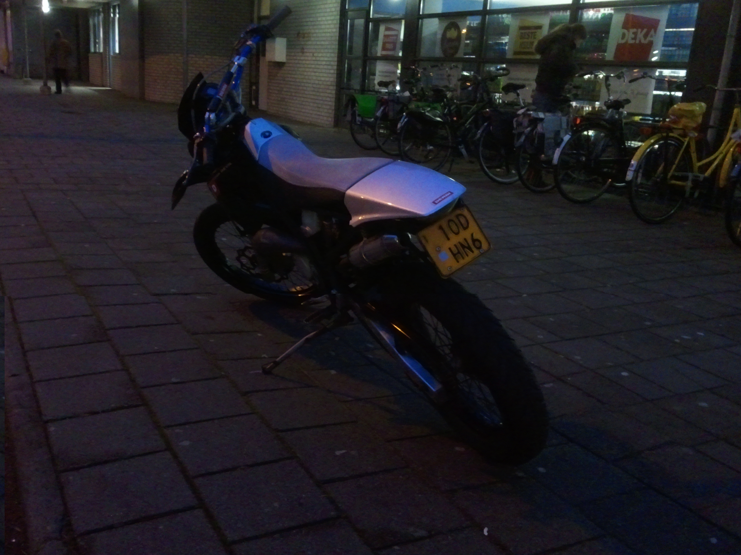 Hier komt voor het gewone rijden een standaard (ontgrensde) uitlaat op, heb ik erbij gekregen, ook heb ik er een 14½ mm carb bijgekregen, booskijkers en nog een kapje achter het zadeltje. Wil hem niet te al hard laten rijden, nu gaat ie te snel. Afvoeren dus.