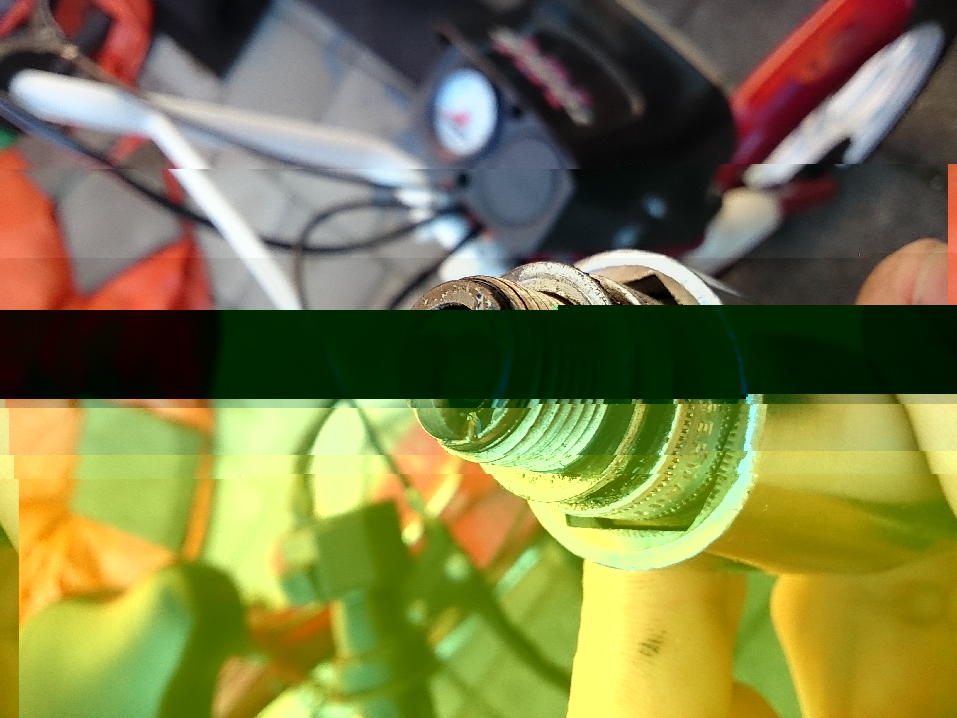 Even afgaande op wat er allemaal afgehaald is (prop inlaat, filter) neem ik aan dat er een 14/9 carburateur op zit. Daar hoort normaal een 50 in. Zoals ik aan de bougiekleur en conditie kan uitmaken is de 51 te groot. Meng je zelf of tank je kant en klaar? In het eerste geval kan je iets teveel olie erbij gooien waardoor de bougie zo nattig blijft. Hou je aan de 1:50 verhouding.