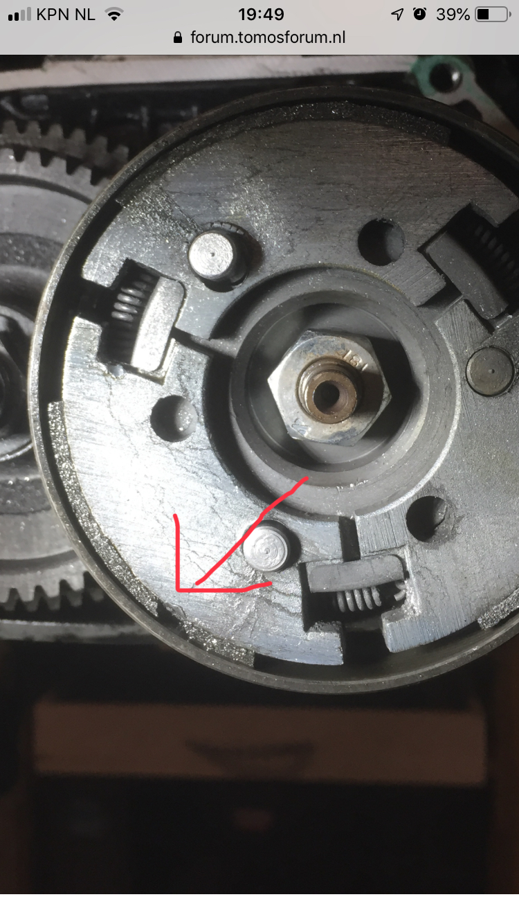 Hoop dat de pennen van de koppeling niet weer naar buiten komen, haken normaal in de koppelingsnaaf en kunnen dan niet naar binnen of buiten.....tenzij de sleuven uitgesleten zijn. https://www.tomos-parts.nl/tomos-standa ... ersnelling