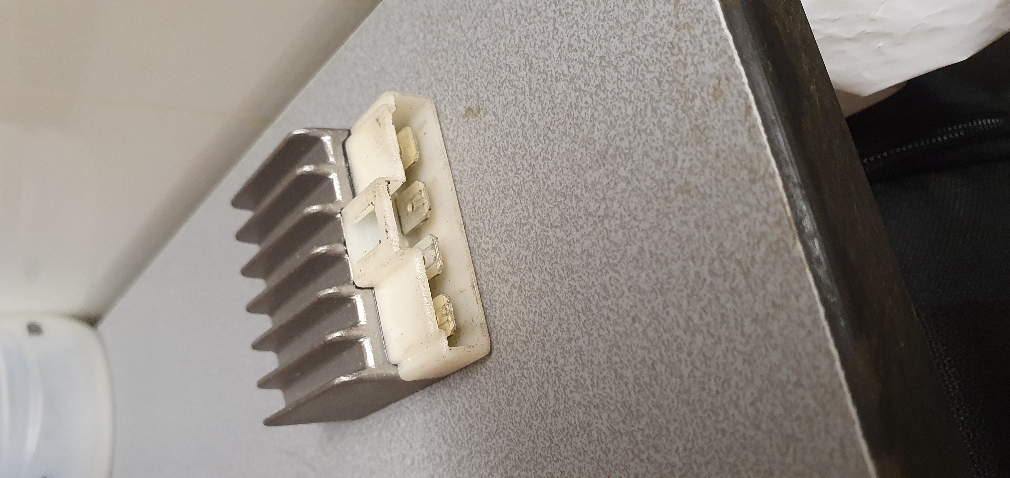 Bedrading is volgens de vorige eigenaar nooit uit elkaar geweest, is dit een sluiting ergens of is hier de spanningsregelaar niet in orde. Deze is wel al een keer gewisseld voor een andere gebruikte omdat bij de voorgaande de lamp zelfs niet een pitje liet zien. Bedrading uit de ontsteking is vier aderig waarvan de gele naar de ingang van de spanningsregelaar gaat, bruin naar de massa en rood naar de bobine de rood/witte zit niet aangesloten.